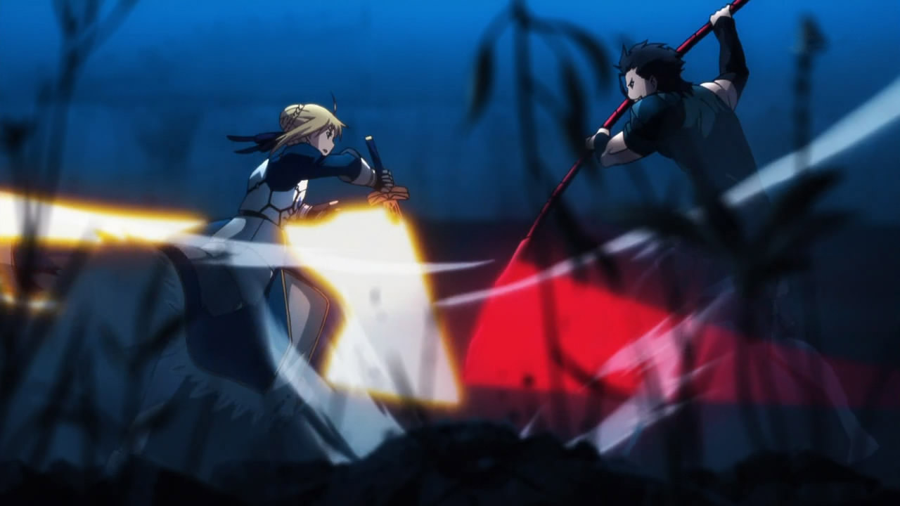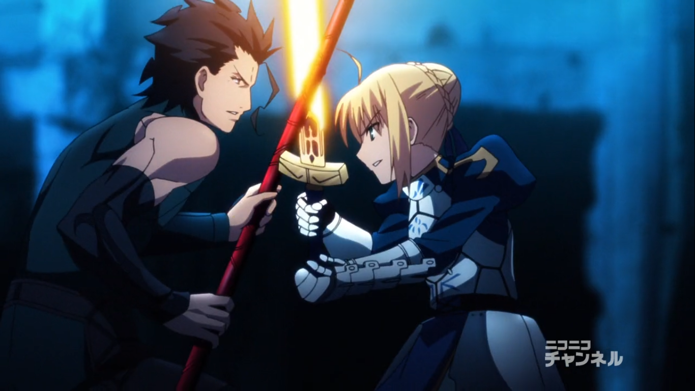 The show had some other pretty great fights as well. Berserker vs Saber and Gilgamesh in round one was pretty great. It was epic for other reasons that I will go into in a second, but the actual fight was fun. Berserker was really the underdog throughout the whole series so it was always good to see him show everyone up. Finally, Saber’s battles against Lancer were great since they were the only really intense blade battles that we got. (Berserker had a brief scuffle as well) Those battles likely had the biggest budget in the series. Every swing was powerful and the colors that emanated from their blows looked very nice as they clashed. Blue and red are colors that naturally compliment each other and the fights did a good job of showing this. The choreography was great as well and the fight felt very real. They were easily some of the best fights out there.