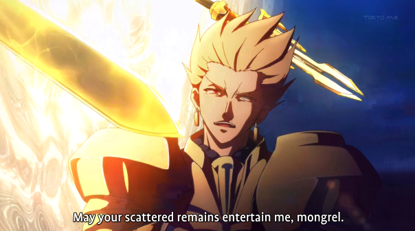 Gilgamesh feels so superior to the other fighters that he doesn’t want them to even look at him without permission. He always treats the rest of the cast as if they are his slaves and they typically humor him. (Since they could die if they didn’t) Gilgamesh loves to toy with Kirei and he constantly goads the villain on for the entire series. Gilgamesh is definitely epic and the voice actor did a good job of expressing his smug demeanor. He is easily one of the highlights of the series and every action scene with him tends to be epic.